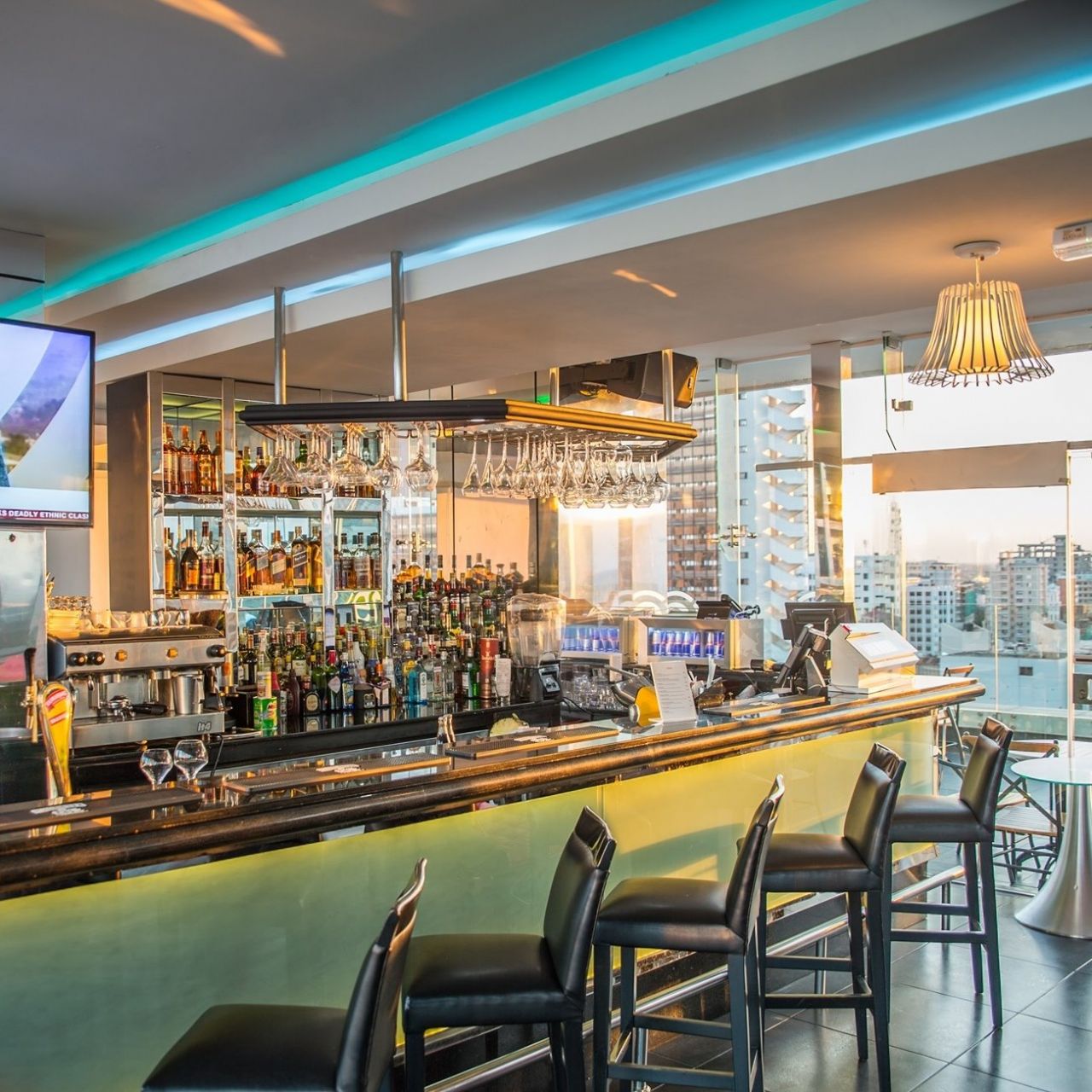 The atmosphere at SkyBar at Onomo is one of chic sophistication. The modern, sleek design, coupled with tastefully selected furnishings, creates a space that is both comfortable and stylish. Glass walls ensure that the remarkable city views remain unobstructed, providing guests with an unmatched dining backdrop. During the day, SkyBar is bathed in the warm, natural light of the Tanzanian sun, creating a peaceful environment for a relaxed meal or a catch-up with friends. As night falls, the space transforms into a vibrant venue bathed in the soft glow of ambient lighting, where the city's skyline creates a dazzling display.